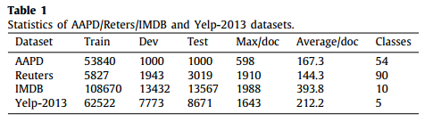 近年来,层次神经网络[15,38]被广泛用于文档分类。为了获取句子间的句法信息,Tang等[38]设计了一种分层架构,使用CNN和LSTM网络结合词嵌入学习文档表示,然后采用GRU网络对文档内的句法信息进行编码。Xu等人[39]提出了一种缓存LSTM模型,该模型应用了一组具有不同遗忘门的LSTM细胞。遗忘率高的门可以学习局部特征,遗忘率低的门可以捕捉全局特征。为了将自注意机制扩展为层次结构,Yang等人[15]提出了一个在句子和文档两个层次上都有注意机制的层次模型。Yin等[42]将任务作为理解问题,提出了一种分层交互的基于注意力的模型来构建文档表示。此外,对于产品评论,一些研究证明,将情感信息与额外的特征(如用户和产品消息)结合起来,对于最终的极性分类是有用的[43-45]。