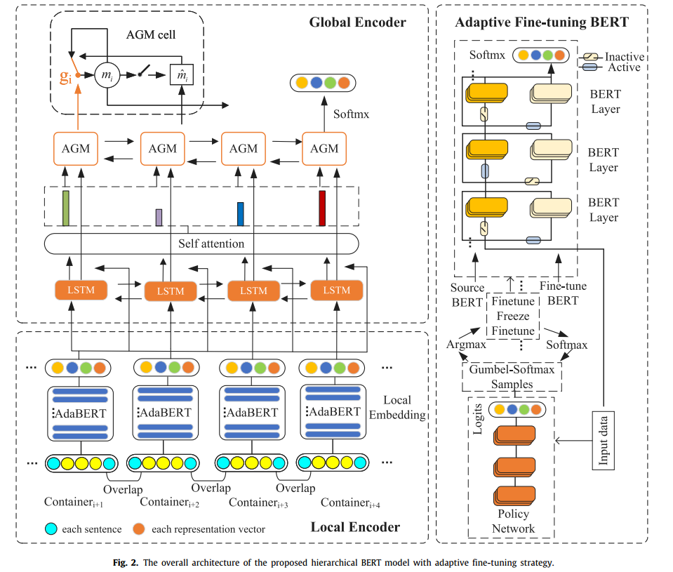 本文提出了带自适应微调策略的分层BERT模型 hierarchical BERT model with an adaptive fine-tuning strategy来解决上述问题。HAdaBERT模型由两个主要部分组成,以分层方式对文档表示进行建模,包括局部和全局编码器。考虑到文档具有自然的层次结构,即一个文档包含多个句子,每个句子包含多个单词,我们使用局部编码器学习句子级特征,而全局编码器将这些特征组合为最终表示。与现有的plm直接截断文档到最大输入长度相比,提议的HAdaBERT使用文档的一部分作为区域,而不是使用一个句子作为一个区域。我们引入了一个容器划分策略来获得有效的本地信息,从而保留语法依赖关系。这样,容器中的关键信息和会被提取到局部编码器。全局编码器使用基于注意力的门控记忆网络学习顺序组合容器之间的语法关系。通过在分层体系结构中使用这两种编码器,该模型可以有效地捕获长文档中的本地信息和长期依赖关系。此外,提出了一种针对每个输入样本的自适应微调策略,该策略网络可以自适应地选择最佳的BERT微调层,以提高模型在训练和推理过程中的性能。这种策略是一种自动的通用方法,可以扩展到其他预训练的语言模型。